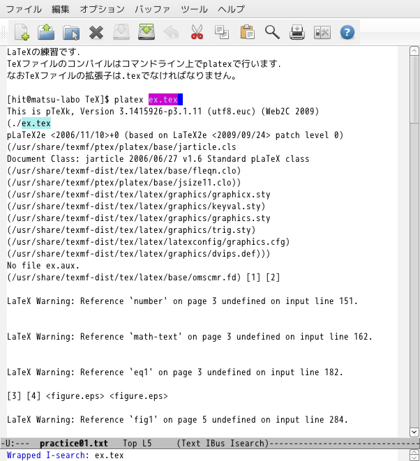 と表示され、一番最初に検索された"ex.tex"に戻ります。後進検索はC+rで、C+sと検索方向が異なるだけで使用法は同じです。試してみて下さい。